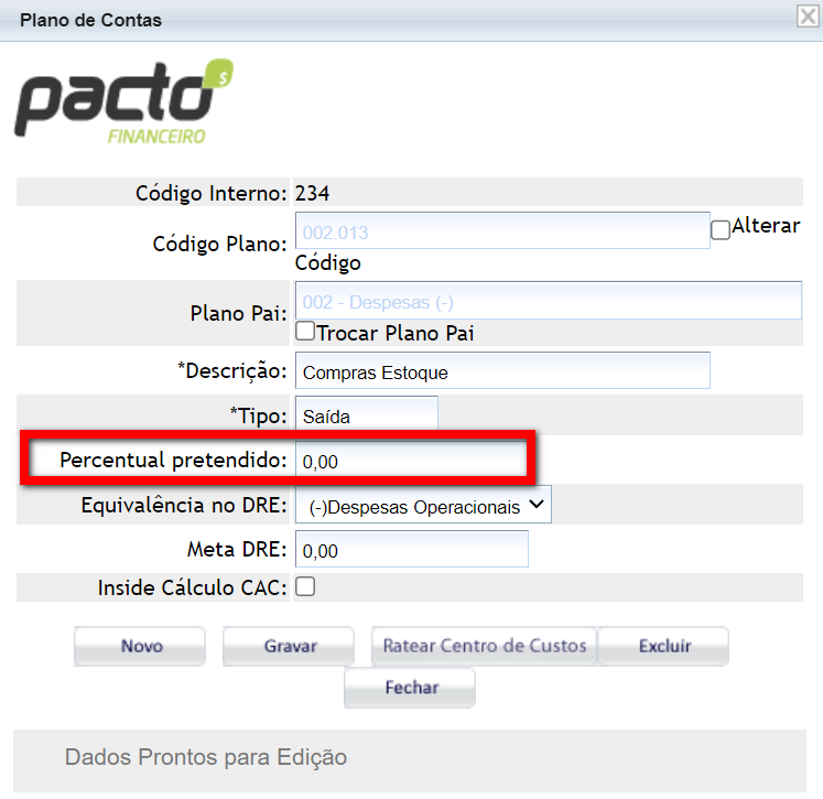 3.1. Quando o plano de contas é do tipo "Saída" o sistema apresenta um novo campo "Percentual pretendido", que serve para inserir um percentual que essa despesa terá em relação as receitas da empresa.