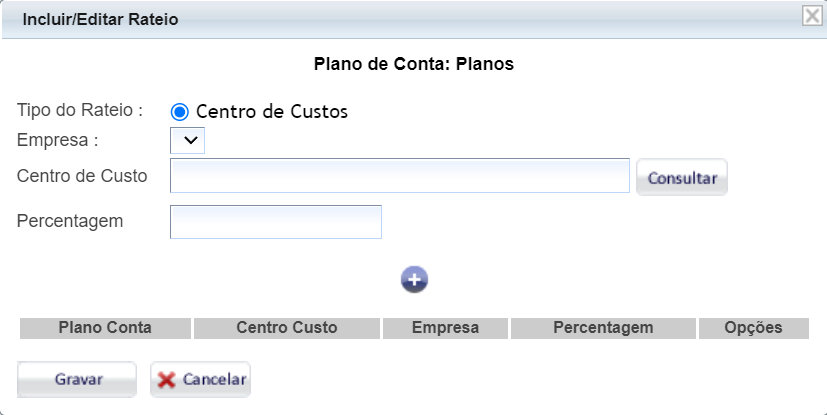 5.1. Ao clicar o sistema listará o campo para adicionar/editar/excluir o rateio do centro de custos vinculado ao plano de contas. Realize as alterações e clique em "Gravar".