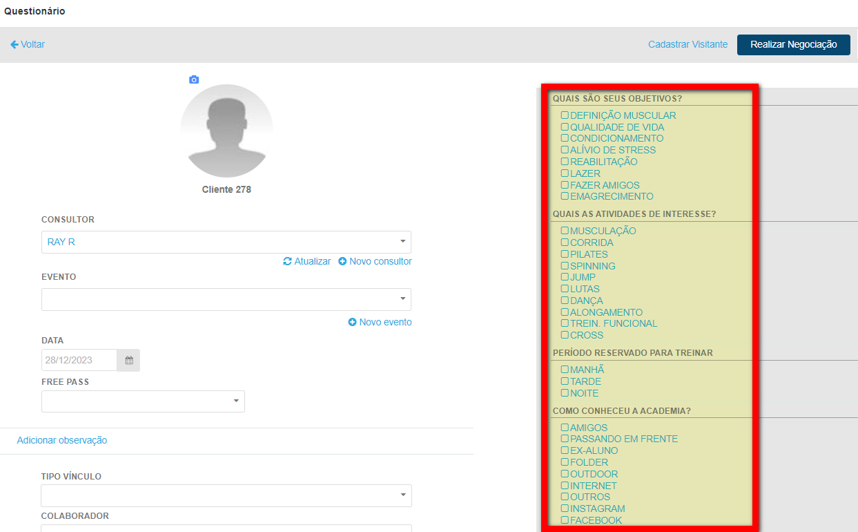 O boletim de visitas é um conjunto de perguntas realizadas para os clientes que visitam sua academia, no intuito de conhecer um pouco do cliente. Pode ser cadastrado para matrículas, rematrículas e retornos.