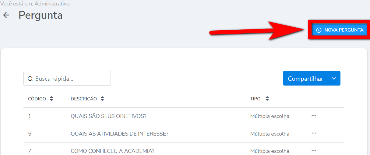 2. Será apresentada a tela contendo o cadastro de todas as perguntas registradas no sistema. Clique em “Nova Pergunta”;