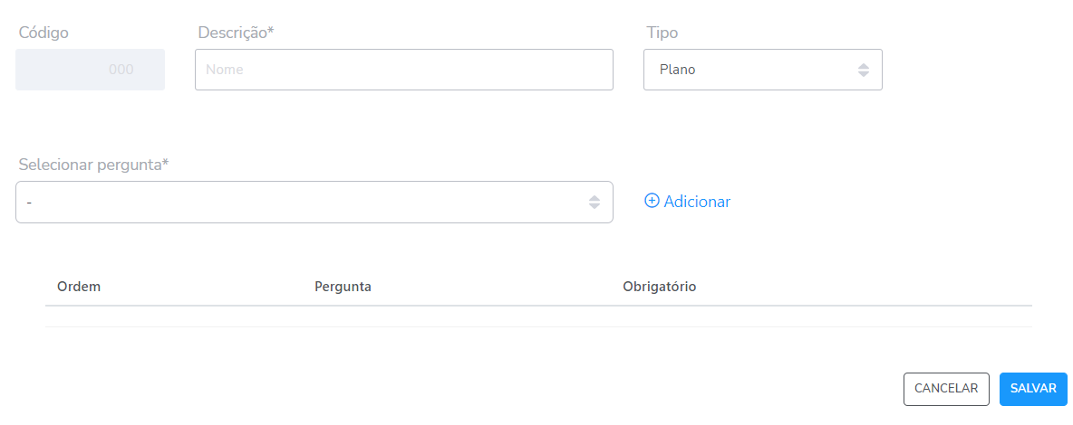 - Tipo: selecione neste campo, dentre as opções apresentadas, se este questionário é direcionado a Planos ou Serviços;