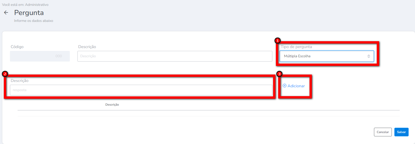 - Múltipla Escolha: ao selecionar esse tipo, o sistema abre um campo para cadastrar as opções de resposta. No campo “Descrição”, preencha com a opção de resposta desejada, depois clique em “Adicionar”, repita o processo para adicionar outras opções de resposta;