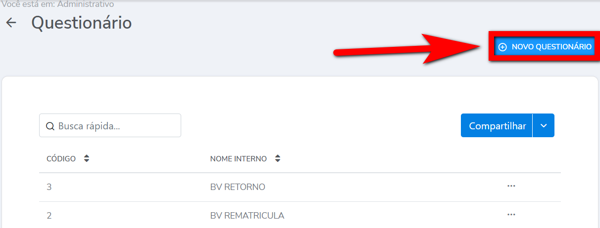 2. Será direcionada a tela contendo todos os questionários cadastro no sistema. Clique em “Novo Questionário”;