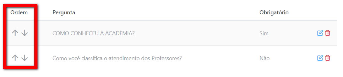 5. Caso deseje alterar a ordem das perguntas, basta clicar nas setas situadas a frente