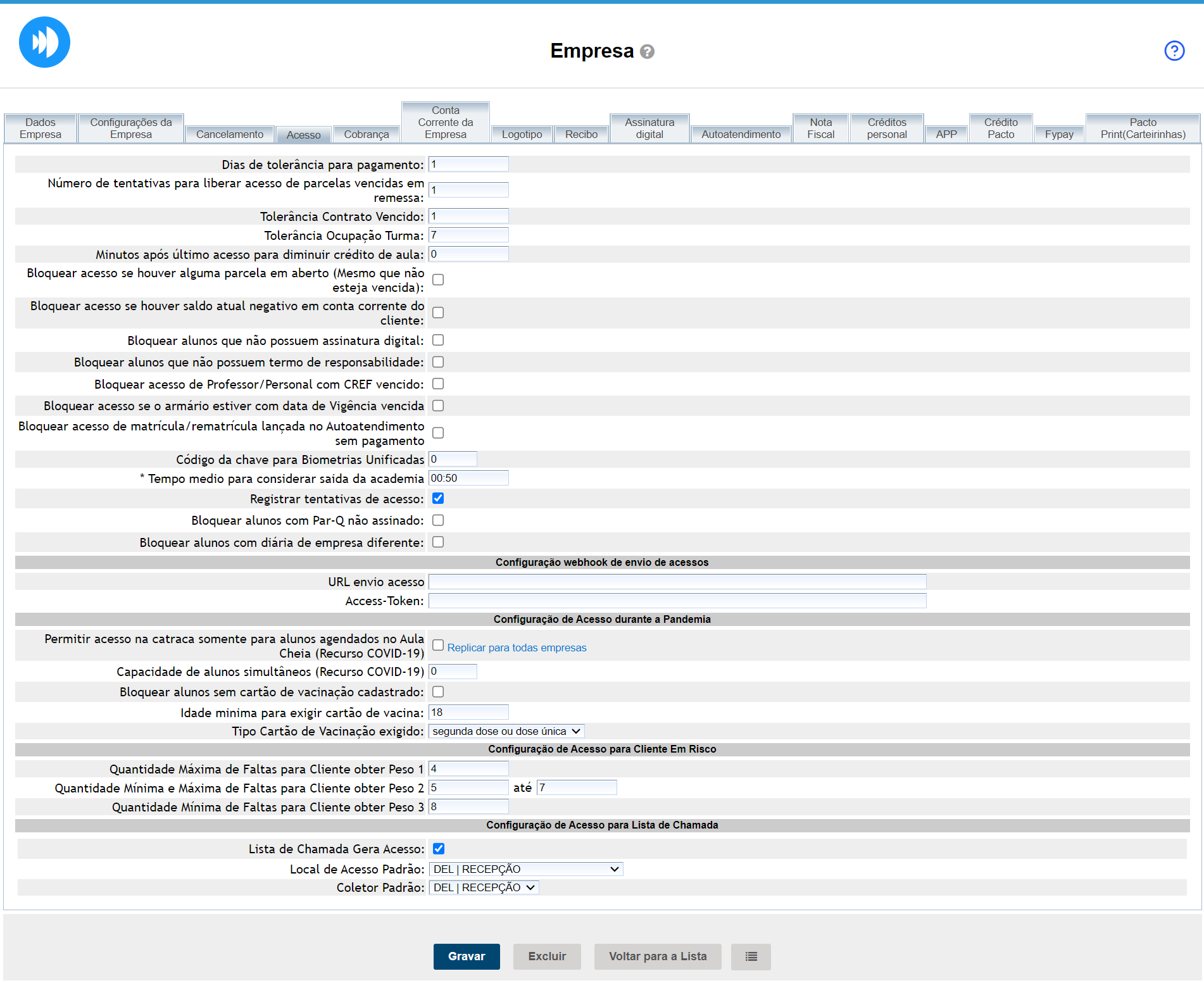 Na guia Acesso nas configurações da empresa, são apresentadas as configurações para o acesso dos clientes e colaboradores pela catraca.