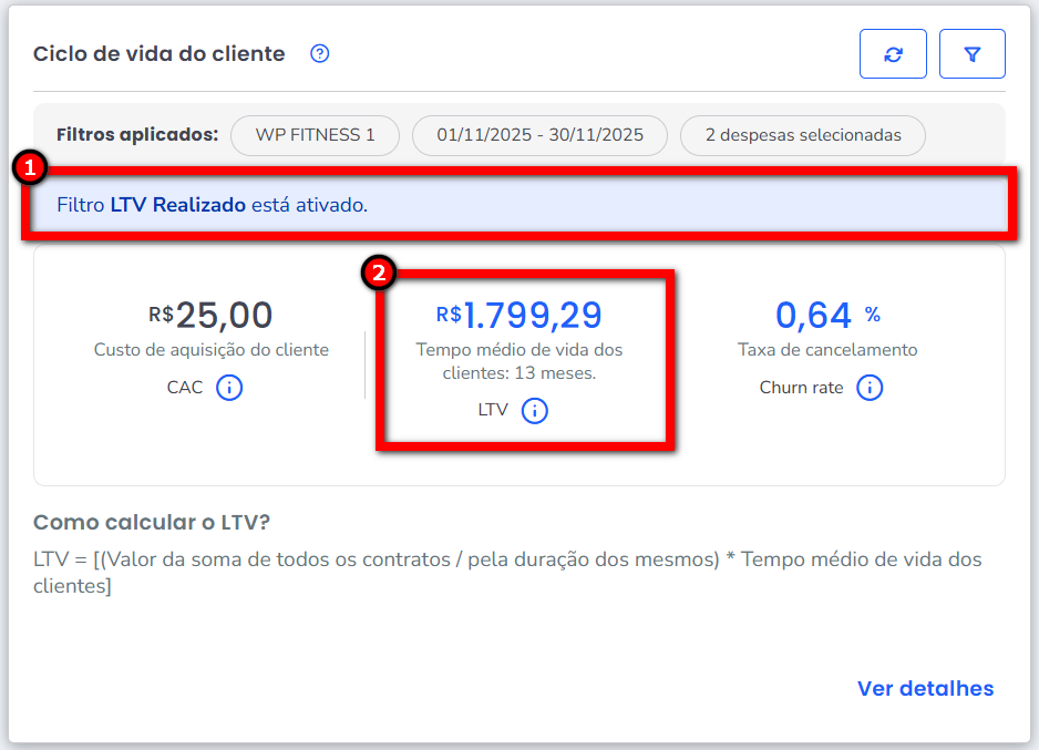 Atenção: por padrão, o filtro "LTV realizado" vem desmarcado. Quando essa configuração estiver ativada, será exibida a mensagem "Filtro LTV realizado está ativado".