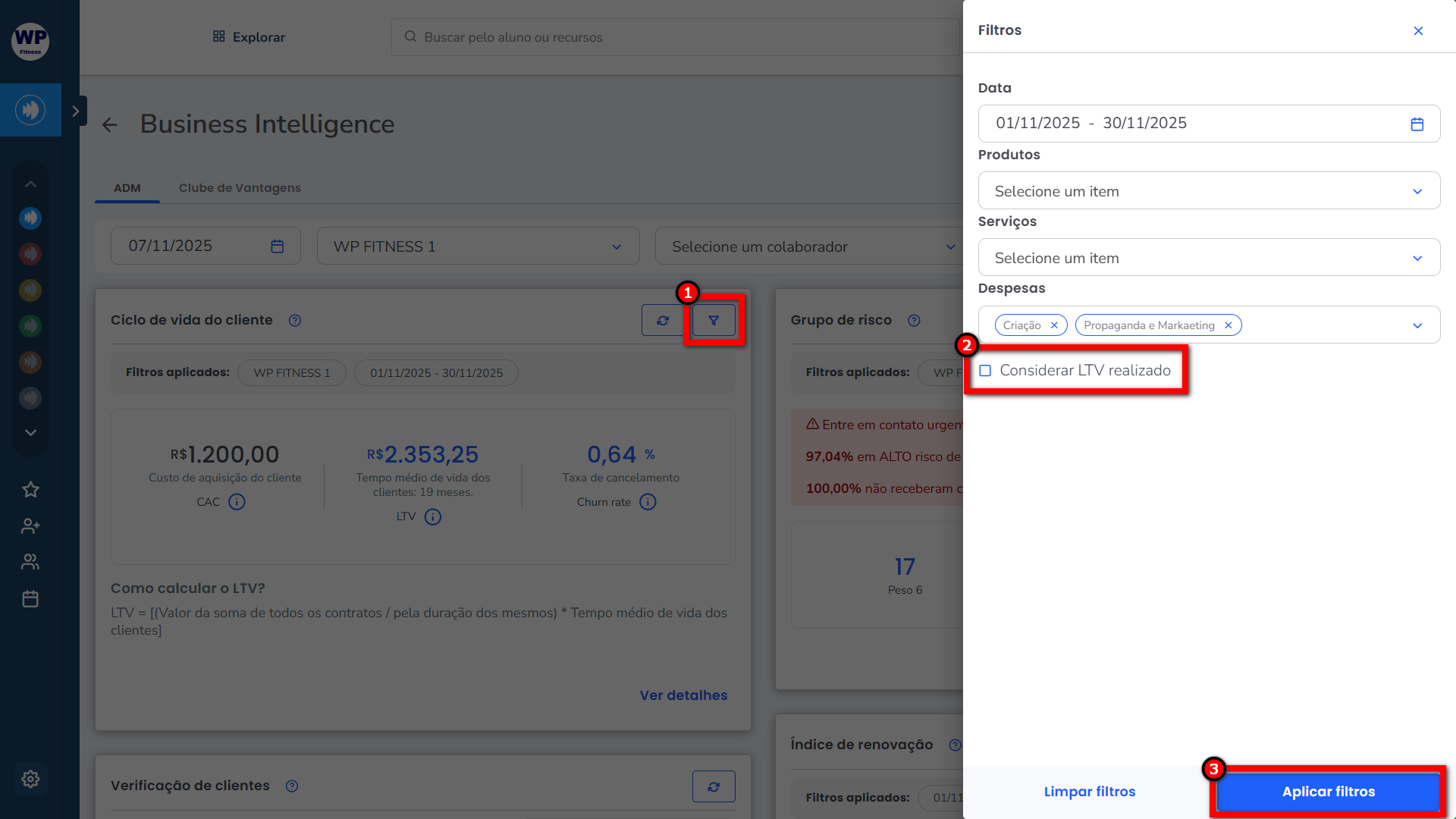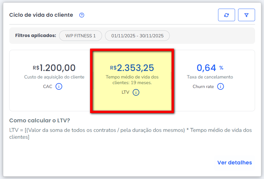 Observação: contratos cancelados afetam o LTV. O valor é alterado pelo filtro de datas presente dentro da engrenagem do BI Ciclo de vida do seu cliente.