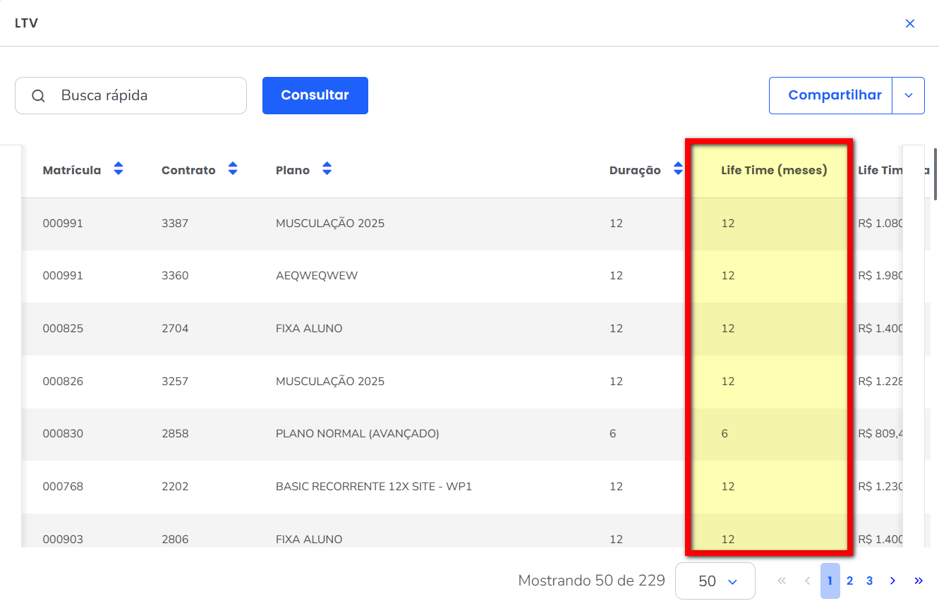 Por exemplo: se o cliente assinou um contrato de 12 meses, mas está apenas no terceiro mês de uso, o sistema considerará os 12 meses para o cálculo. Ao clicar em "Tempo médio da vida dos clientes: X meses", o sistema apresenta o relatório e na coluna "LIFE TIME(MESES)", consegue visualizar o tempo médio da vida previsto por cliente.