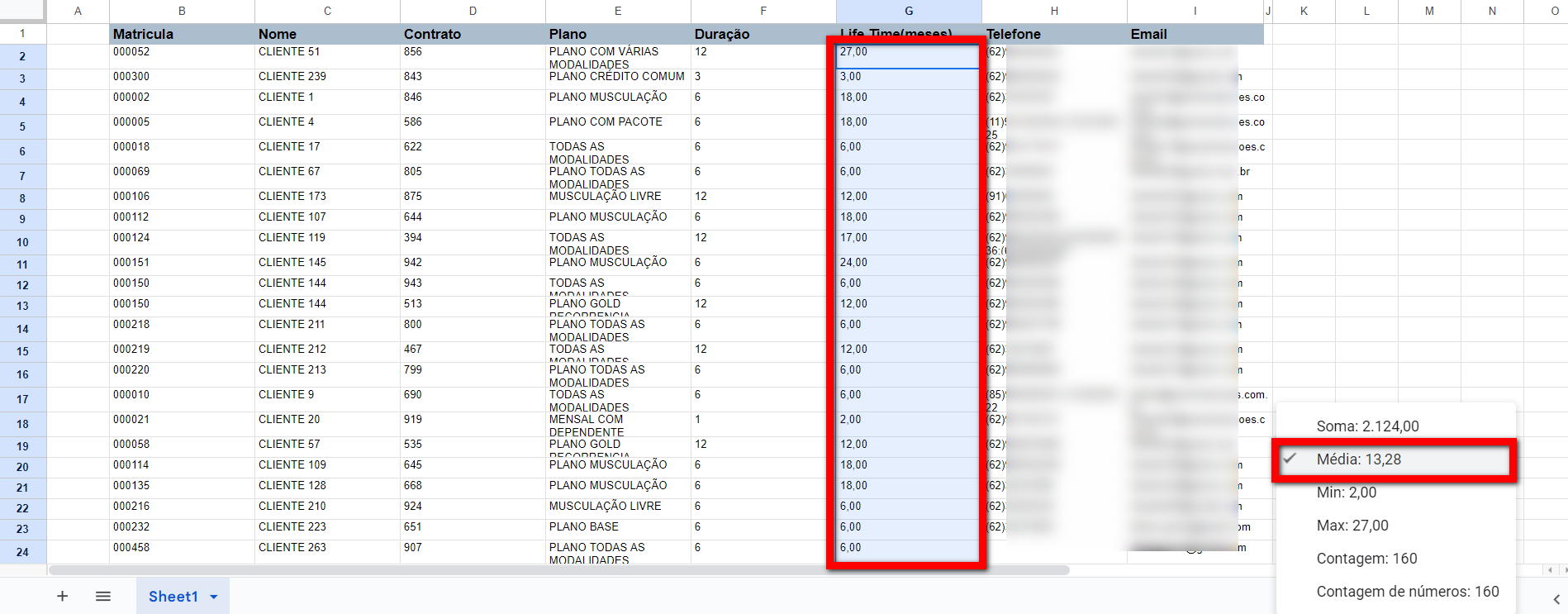 Ao exportar a listagem para Excel, basta selecionar os itens da coluna "Life Time(meses)" e clicar na fórmula no rodapé do Excel, para visualizar a média.