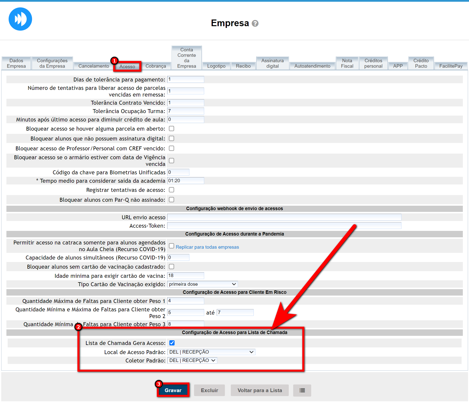 3. Na aba "Acesso" localize e marque a configuração "Lista de Chamada Gera Acesso";