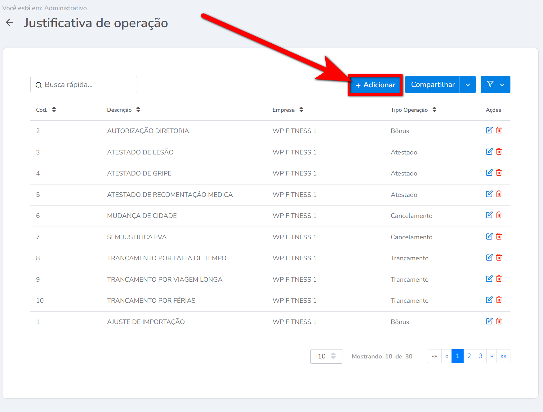 3. Para cadastrar uma nova justificativa de operação, clique em "+ Adicionar";