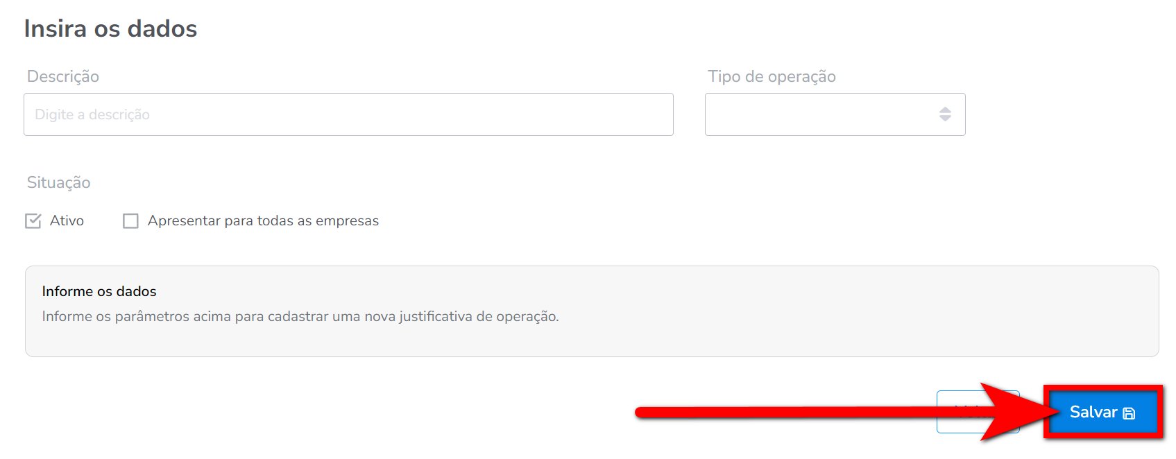 5. Após preencher os campos clique em "Salvar"; 6. Também é possível editar uma justificativa de operação clicando no ícone ou até mesmo excluir quando não foi utilizado, para isso clique no ícone