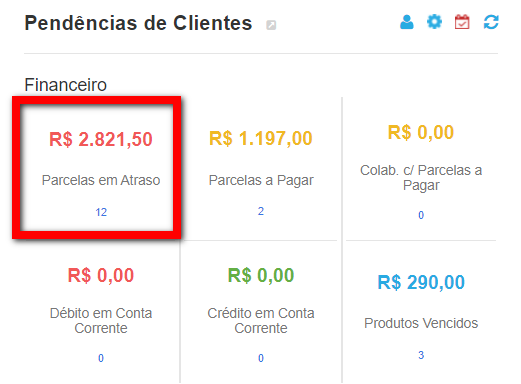 - Parcelas em Atraso: é o total de parcelas de clientes que estão em aberto e até o momento ainda não foram quitadas.