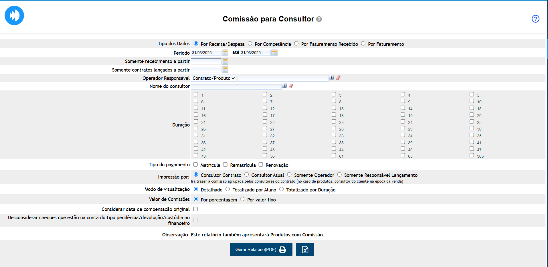 - Totalizado por Duração: não serão apresentados os alunos, somente o valor final da comissão a ser paga para cada consultor.