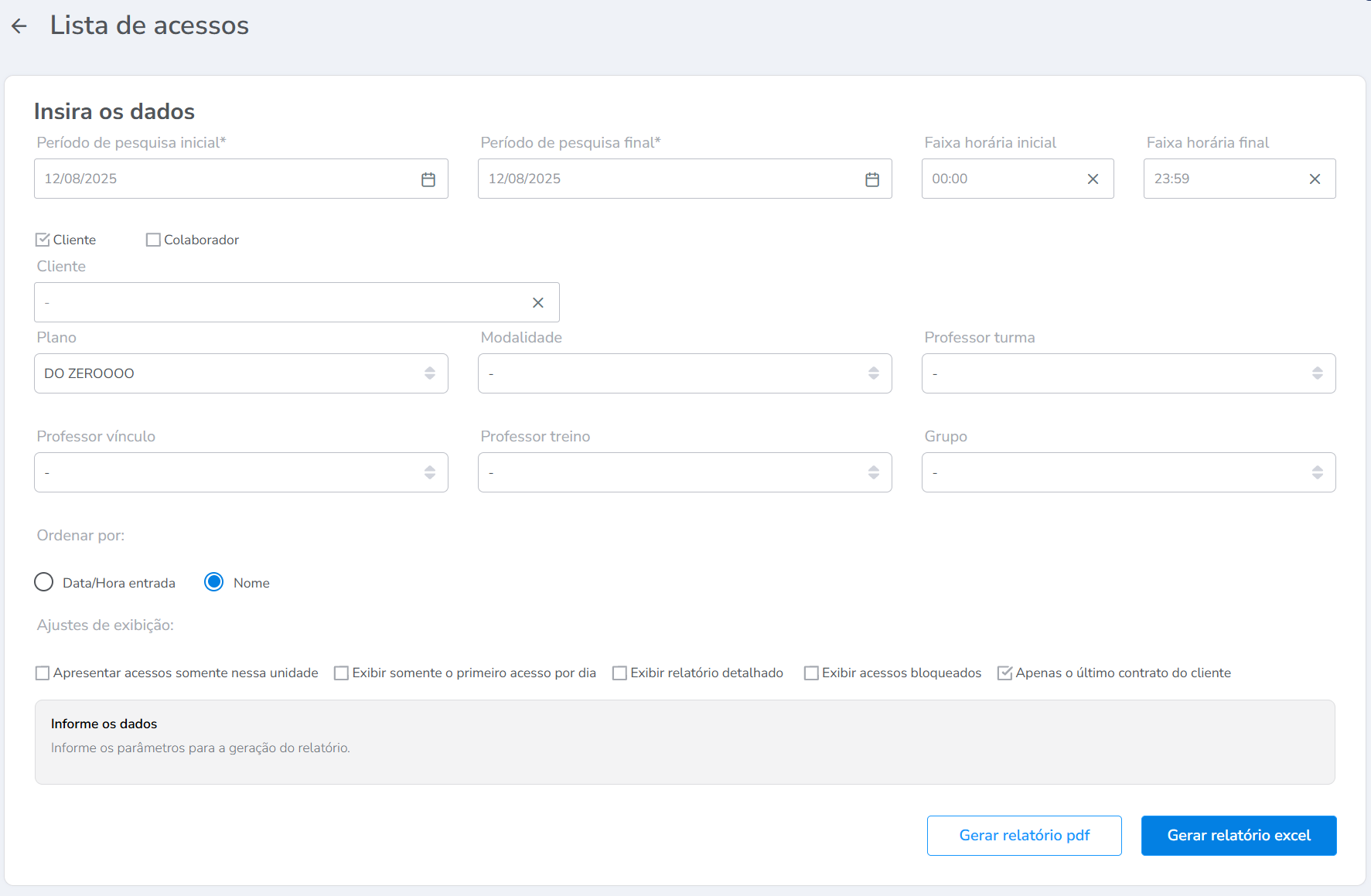 - Professor Turma: caso queria gerar uma lista de acessos, dos clientes, que são vinculados ao professor de alguma turma específica, informe o nome do colaborador neste campo;