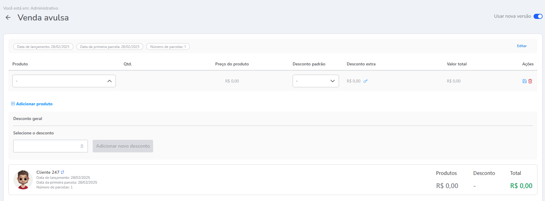 3. Na tela do "Venda avulsa" com o cliente selecionado, basta realizar a leitura do código de barras com o leitor, que o sistema irá selecionar o produto automaticamente;