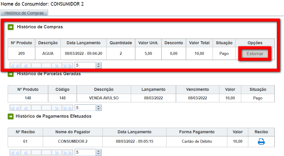 3. Ao apresentar a tela com os detalhes da venda, no campo "Histórico de Compras" possui a descrição e detalhes do produto vendido, e a sua frente o botão "Estornar", clique nele.