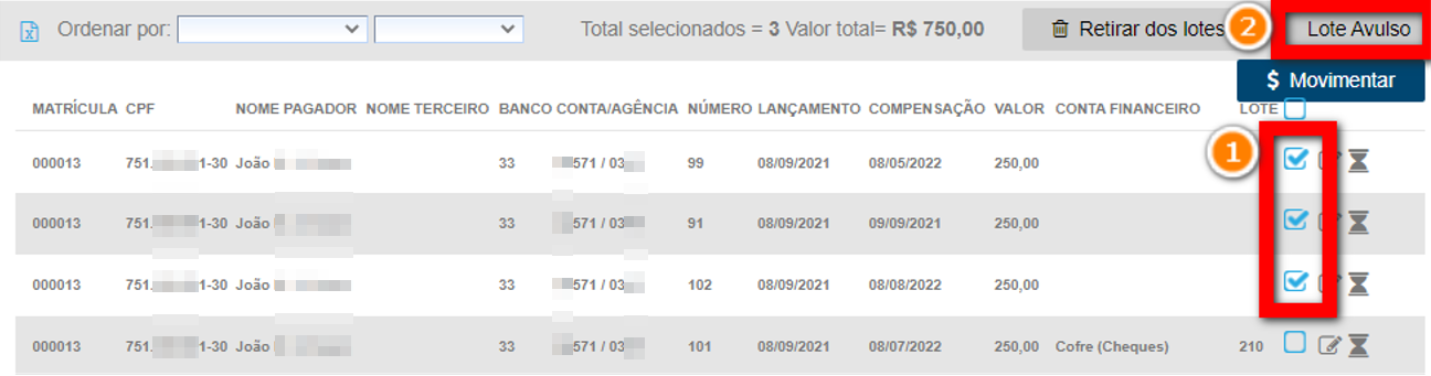 Observação²: o sistema só permite criar Lote Avulso para recebimentos da forma de pagamento Cheque.