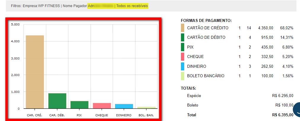3. Ao concluir o carregamento, será apresentado um gráfico exibindo o valor total de recebíveis, com base nos filtros aplicados, separados por forma de pagamento. No gráfico, clique sobre a barra que representa a forma de pagamento "Cheque";