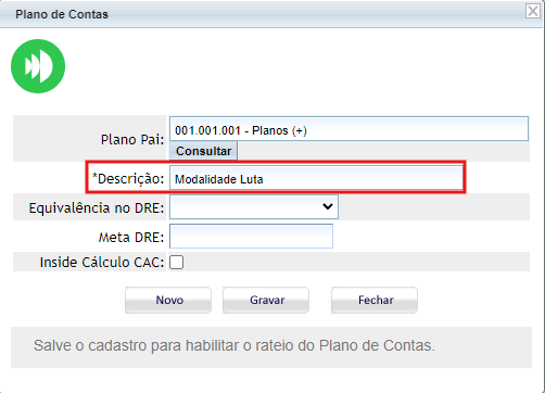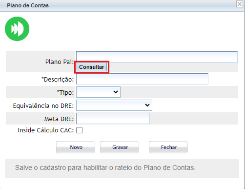 Atenção: é possível criar um novo plano de contas que não possui um "Plano Pai" sendo, neste caso, o plano de contas criado o plano pai. Se este for o caso no campo "Tipo" é necessário informar se este plano criado será para Entrada, Saída ou Investimento.