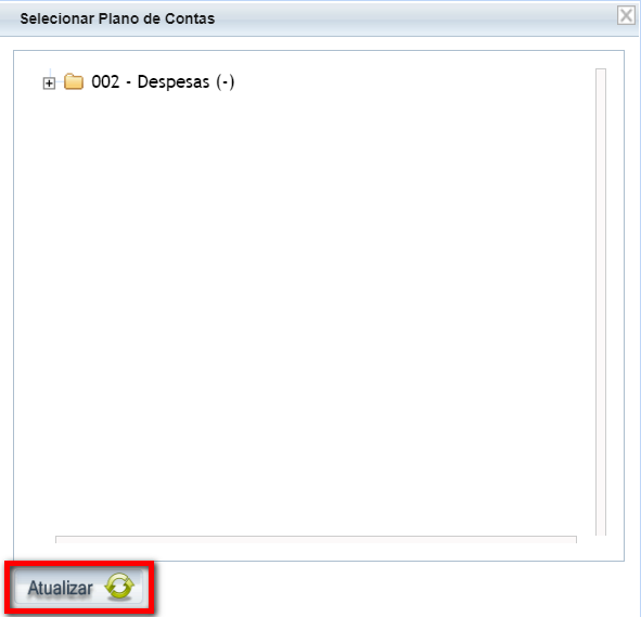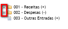 5. Será exibido os planos pais, desta forma, basta clicar no ícone para expandir os subitens de cada Plano de Contas até identificar o plano que deseja associar a este cadastro;