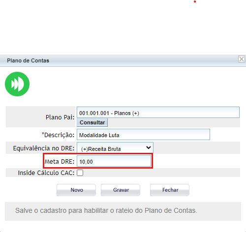 Por Exemplo: a meta estabelecida para este plano de contas é 10%, considerando que a Receita Bruta no DRE é 100 mil, então os valores destinados ao plano que está cadastrando, somados, devem atingir um total 10 mil, para atingir a meta.