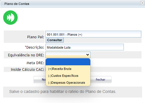 8. No campo "Equivalência no DRE", selecione a opção que corresponde a alocação dos valores associados a este cadastro no relatório DRE;