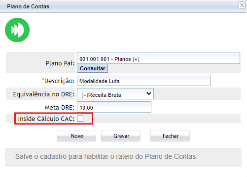 10. Marque o campo “Inside Cálculo CAC'', apenas se os valores associados a esse plano de contas façam parte dos valores de Custo de Aquisição do Cliente. Essa informação será usada para o BI Ciclo de Vida, localizado no módulo ADM;