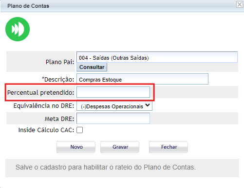 11. Quando o plano de contas é do tipo “Saída” o sistema apresenta um novo campo “Percentual pretendido“, que serve para inserir um percentual que essa despesa terá em relação às receitas da empresa.