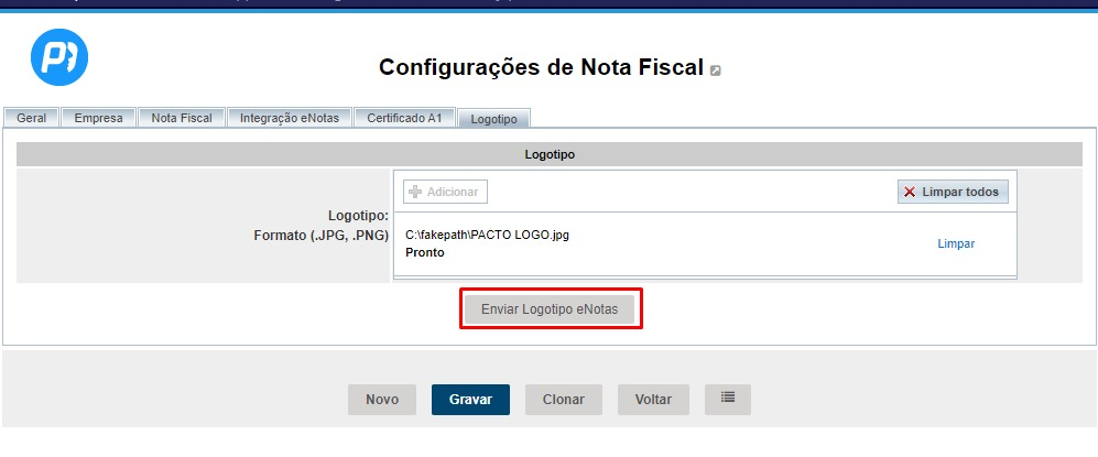4. Em seguida clique no botão cinza "Enviar Logotipo eNotas";