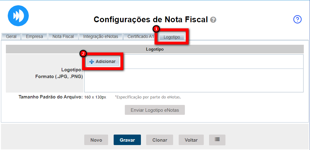 Atenção: o tamanho da imagem padrão aceito é de 160 x 130 pixels. É importante lembrar que esse padrão é estipulado pela prefeitura/SEFAZ. Caso a imagem não esteja neste formato, a logo da empresa não será apresentada no PDF da nota.