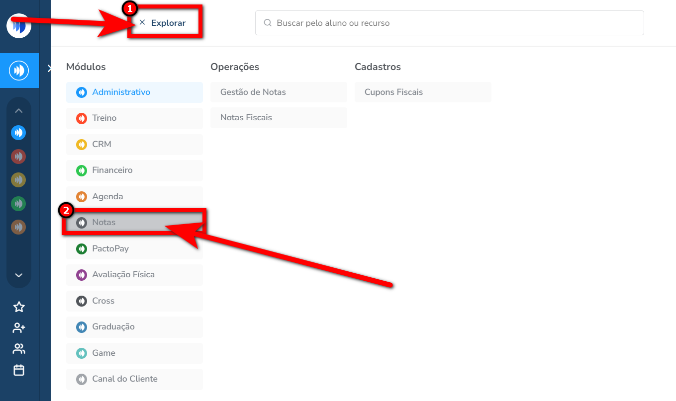 1. Para acessar o módulo existe 3 formas. 1. No módulo que você estiver logado, clique em "Explorar", em seguida clique em "Notas";
