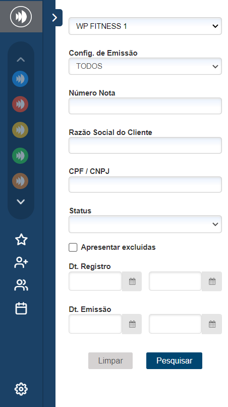 - Config. de Emissão: essa configuração é usada para a academia que utiliza 3 tipos de nota fiscal (NFS-e, NF-e e NFC-e), lá você pode selecionar qual tipo de nota quer visualizar na sua busca;
