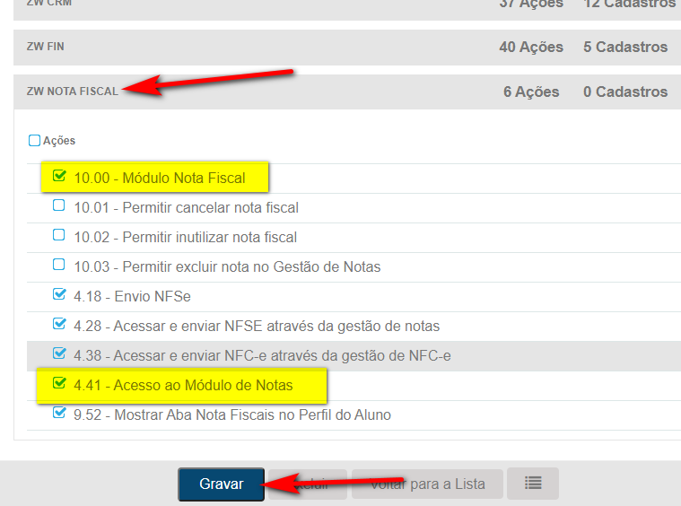 3. Procure e habilite as permissões referentes ao módulo de "Nota Fiscal";