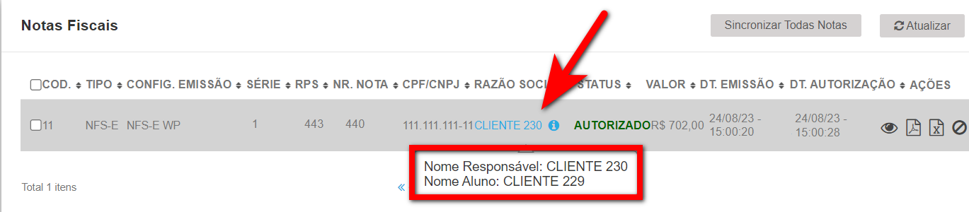 6. No "Módulo Notas Fiscais", será apresentada a nota já com o CPF e nome do Terceiro, e ao passar o mouse por cima do nome, consegue identificar o nome do cliente cadastrado no sistema.