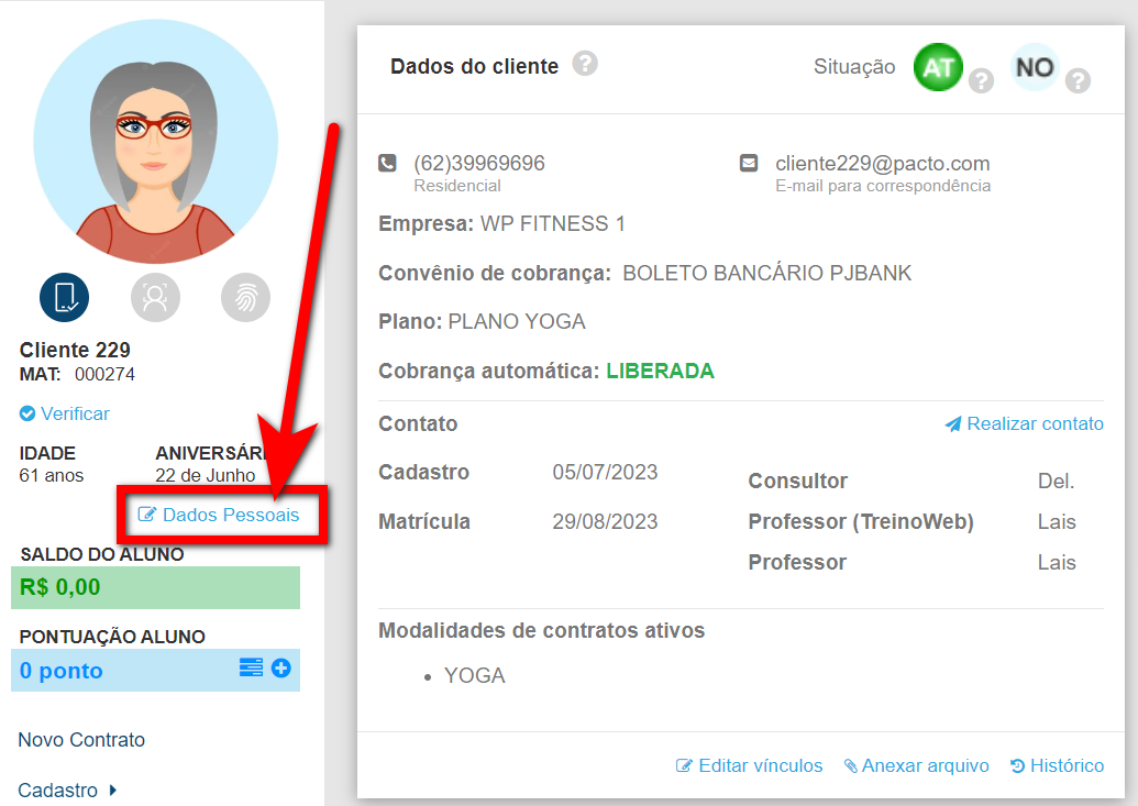 1. No perfil do cliente você vai clicar em "Dados Pessoais";