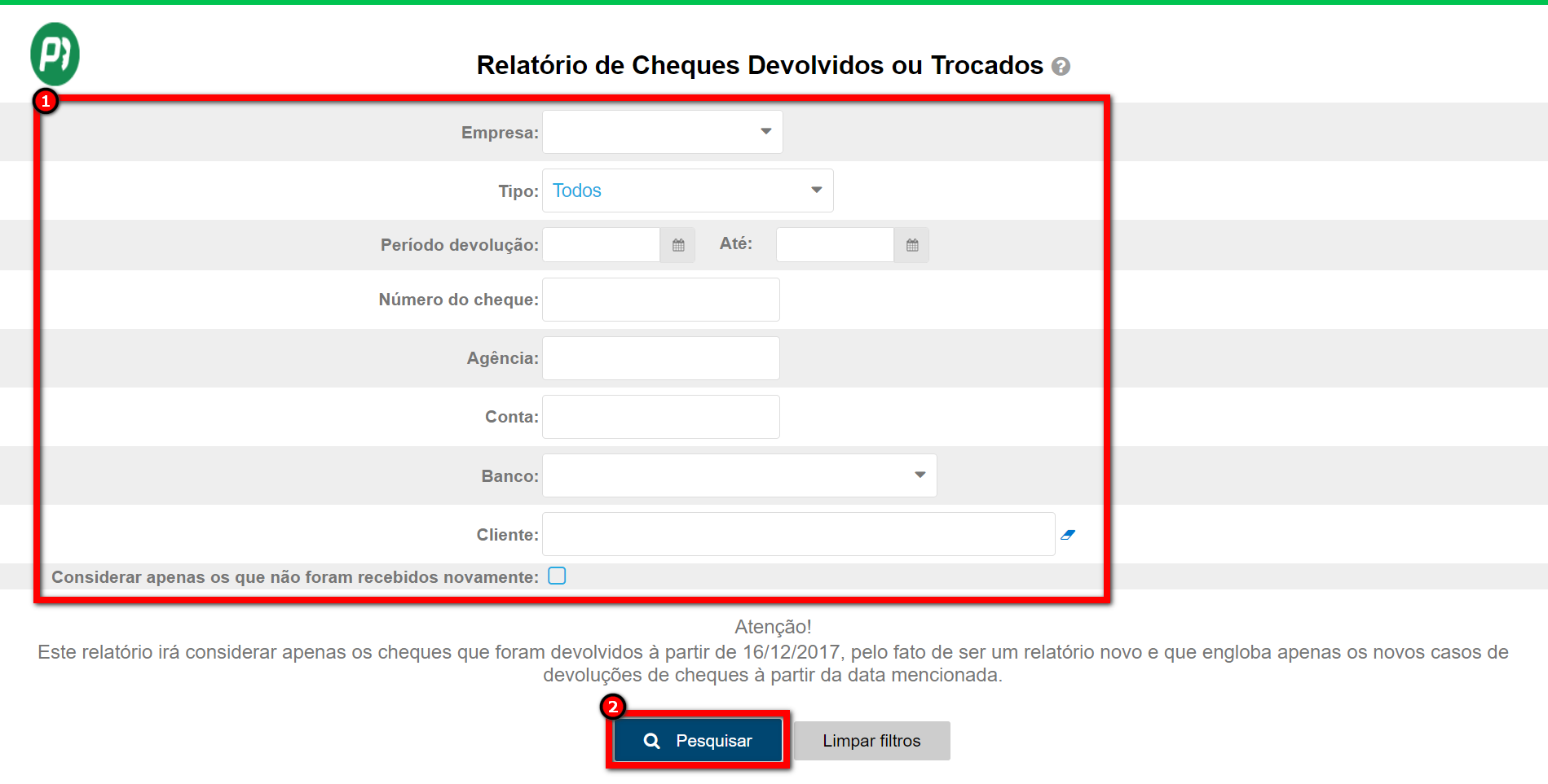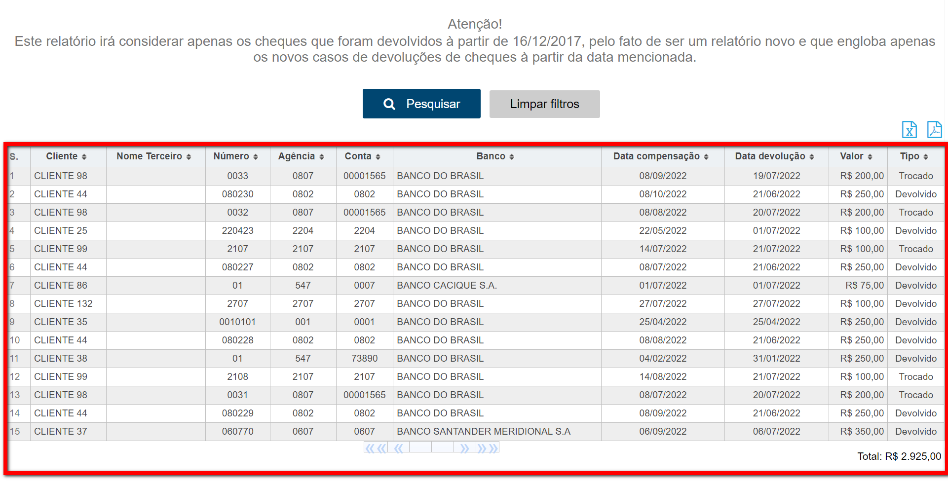 Atenção: este relatório irá considerar apenas os cheques que foram devolvidos à partir de 16/12/2017, pelo fato de ser um relatório e que engloba apenas os casos de devoluções de cheques à partir da data mencionada.