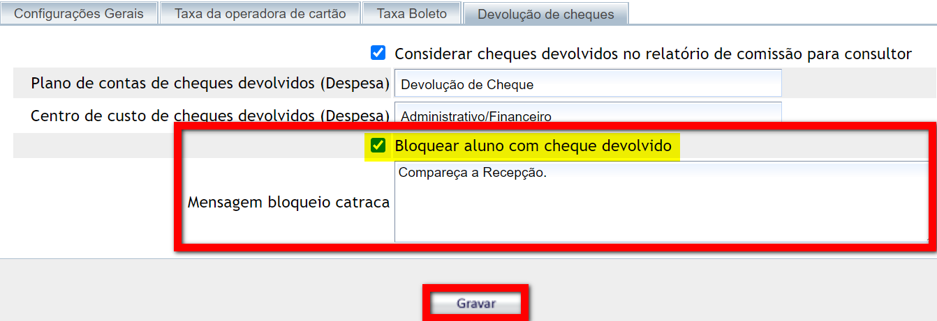 3. Localize a configuração "Bloquear aluno com cheque devolvido" e marque o checkbox a sua frente;