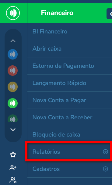 1. No menu lateral do módulo Financeiro, clique em “Relatórios“;