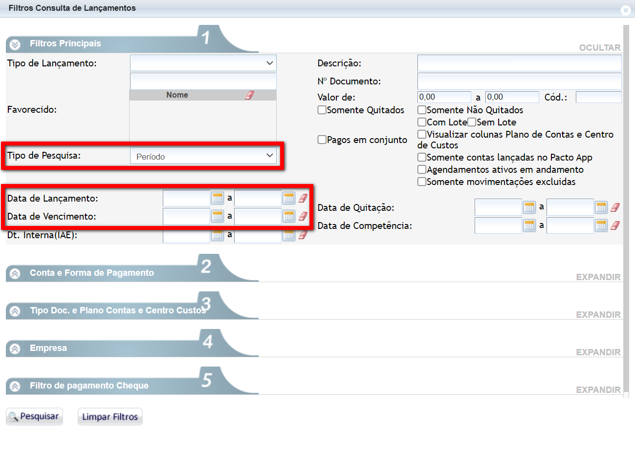 4. Aplique os filtros para encontrar as contas que estão agendadas. Pode pesquisar por “Período” e informar a “Data de Lançamento” da conta, ou pela “Data de Vencimento” da conta. Após clique em “Pesquisar“;