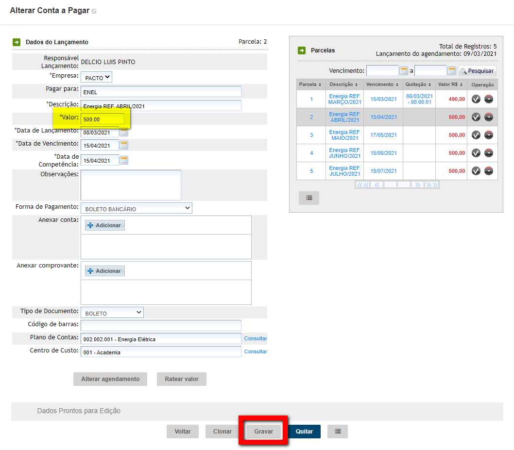 5. Existem duas formas, sendo a primeira a edição da conta e a segunda a edição apenas do valor (as duas formas serão apresentadas abaixo):