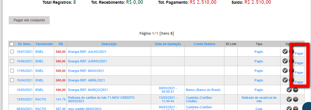 5.2. Após realizar a pesquisa e encontrar a conta que precisa ter seu valor alterado, clique em "Pagar".