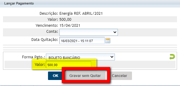 5.2.1. O sistema abrirá um pop-up onde você deverá realizar a alteração do valor e clicar em "Gravar sem quitar".