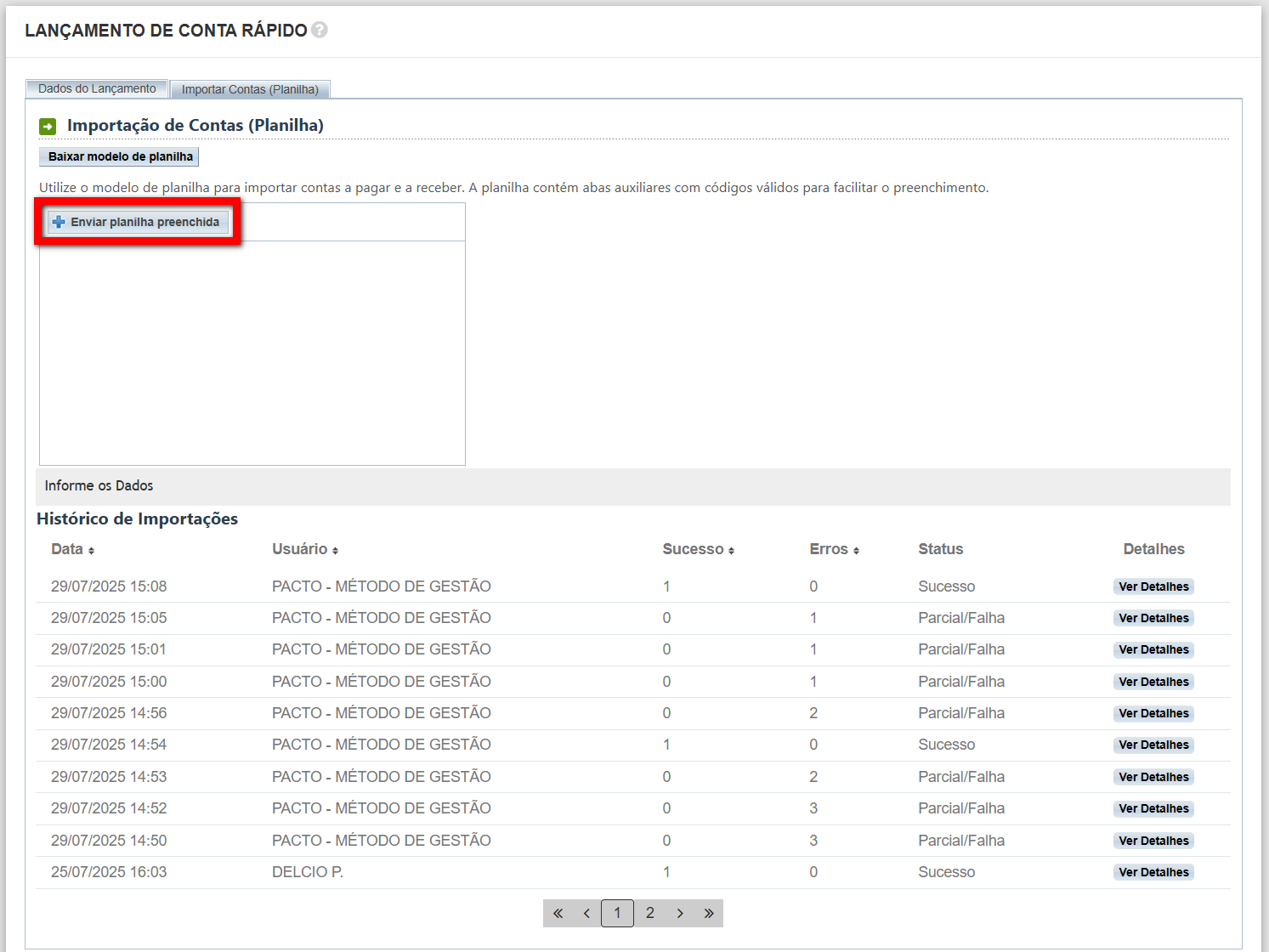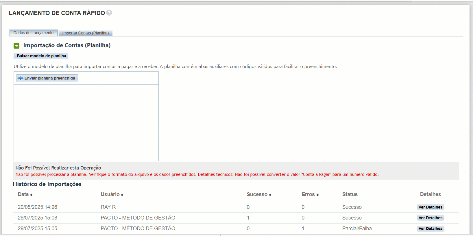 Lançamento rápido importando arquivo de planilha