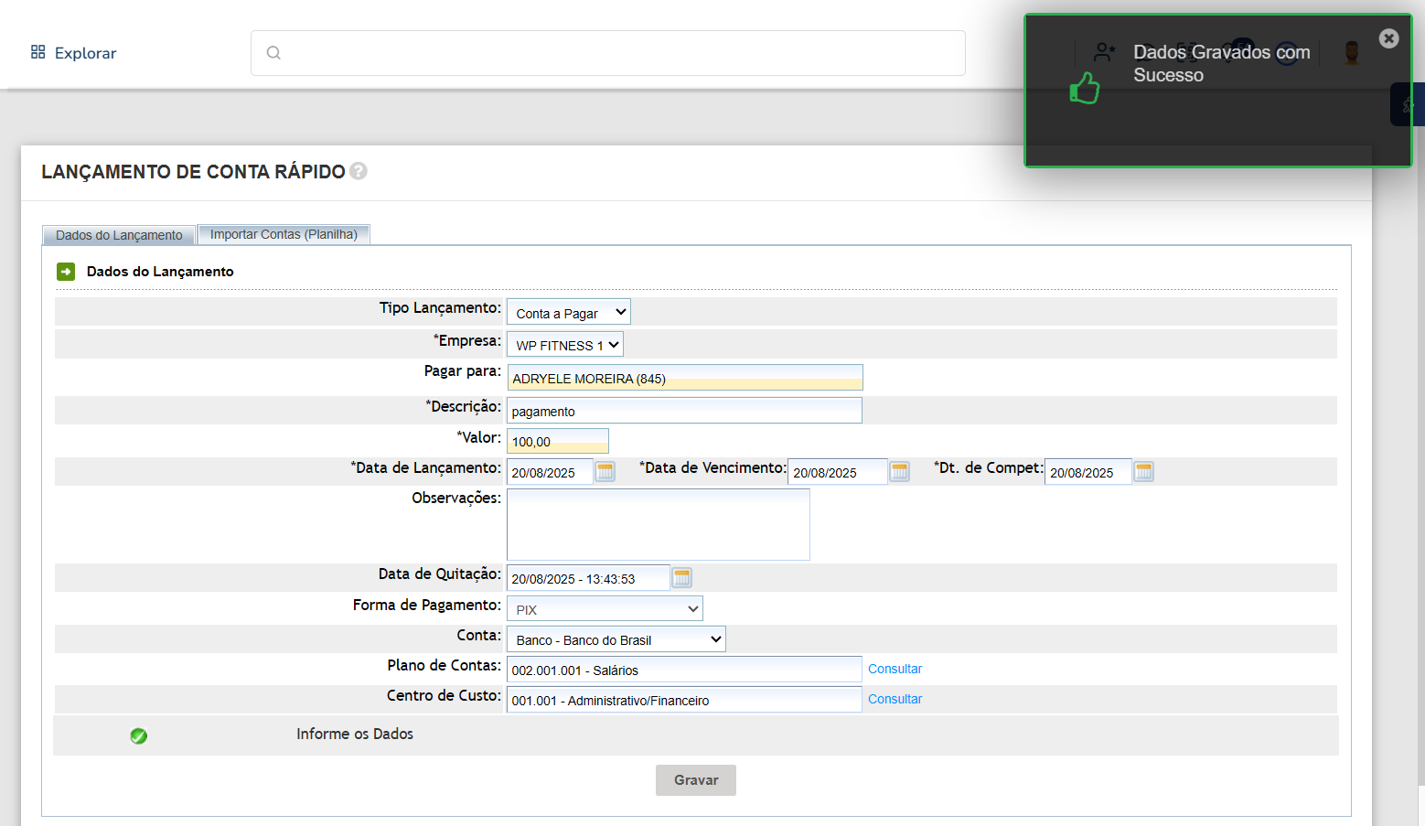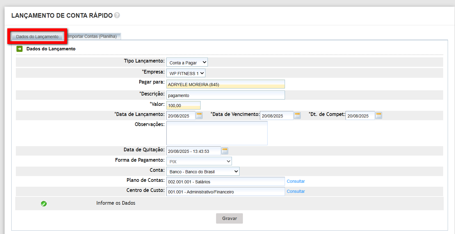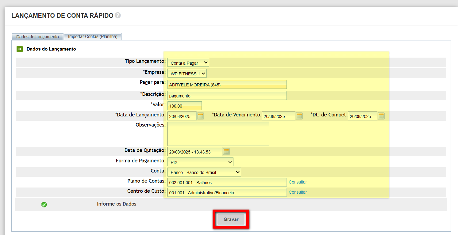 2. Após finalizar o preenchimento, clique em "Gravar" para realizar o lançamento.