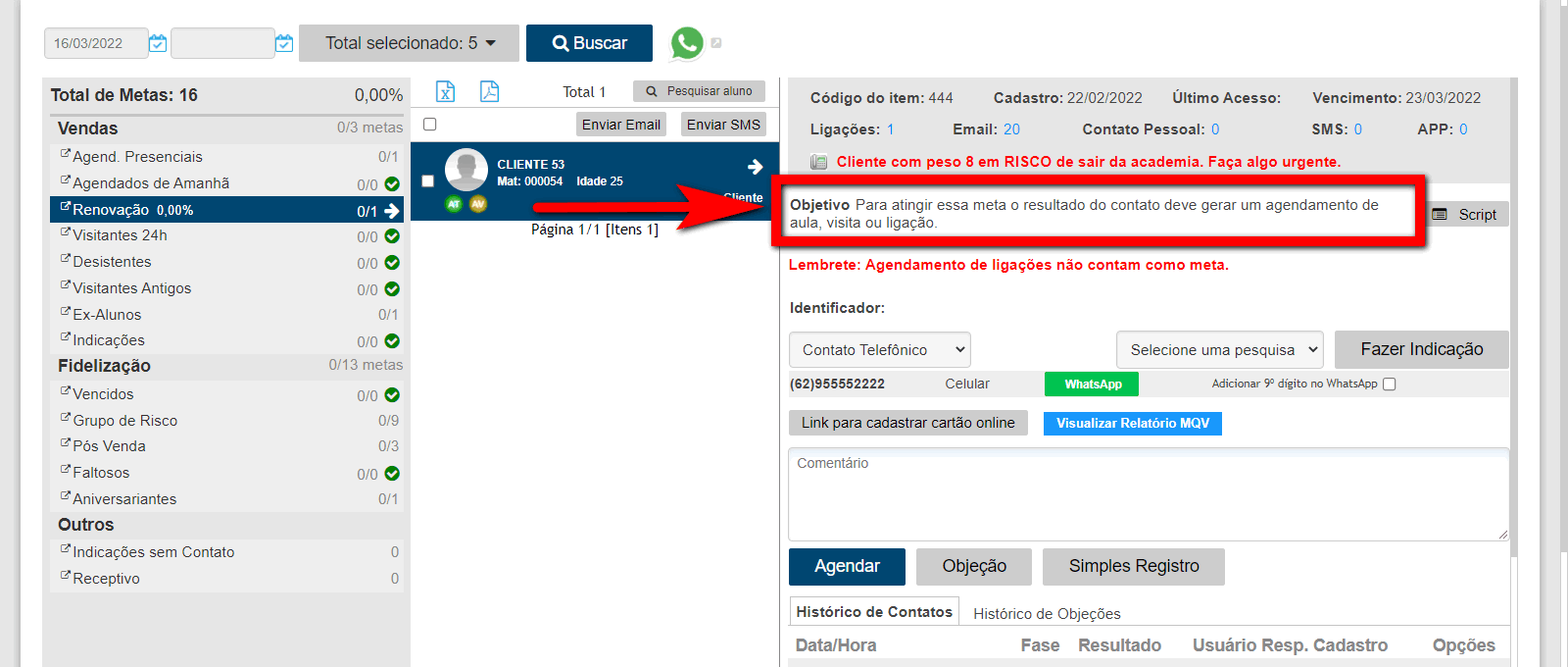 Para esse exemplo (fase de renovação), só bate meta se tiver um Agendamento. Se fizer um Simples Registro ou Objeção, fica guardado a informação no Histórico de Contatos, mas não bate a meta do CRM, não atingindo os 100%.