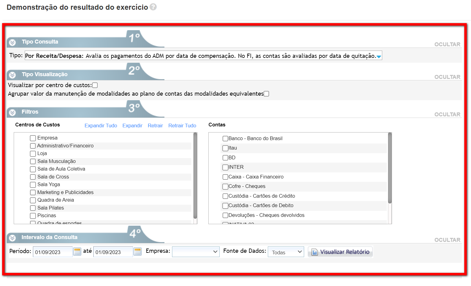 - Contas: caso deseje que os dados apresentados no relatório sejam referentes a uma Conta Financeira específica, selecione marcando o checkbox a sua frente.
