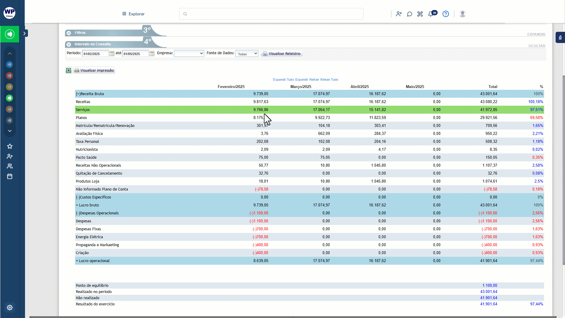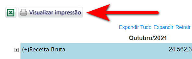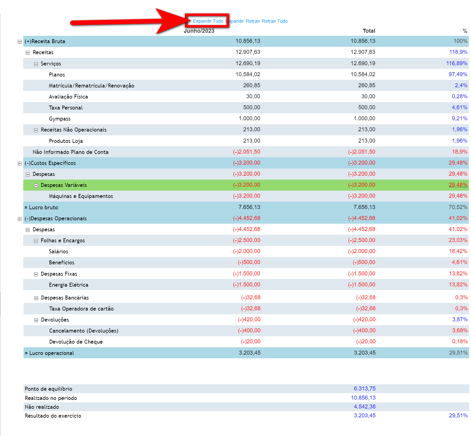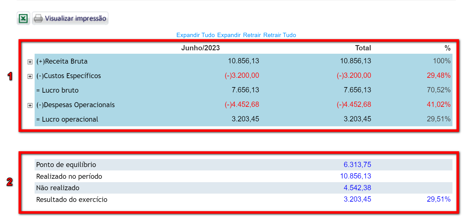 6. Para visualizar informações mais específicas sobre os valores apresentados na Receita Bruta, Custos Específico e nas Despesas Operacionais, clique em "Expandir Tudo".