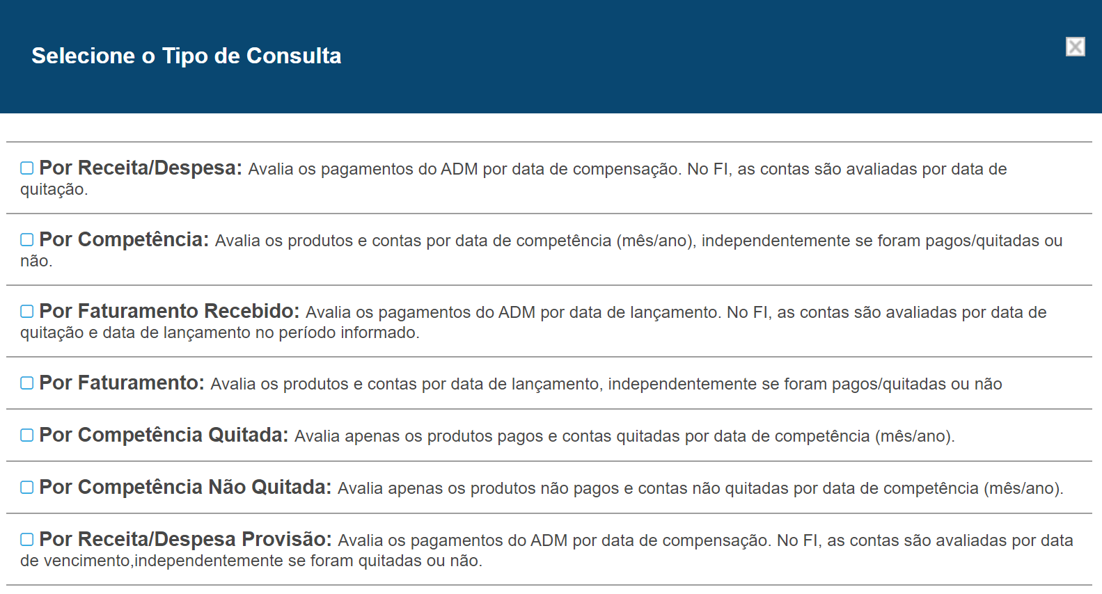 - Por Competência Não Quitada: avalia apenas os produtos não pagos e contas não quitadas por data de competência (mês/ano);