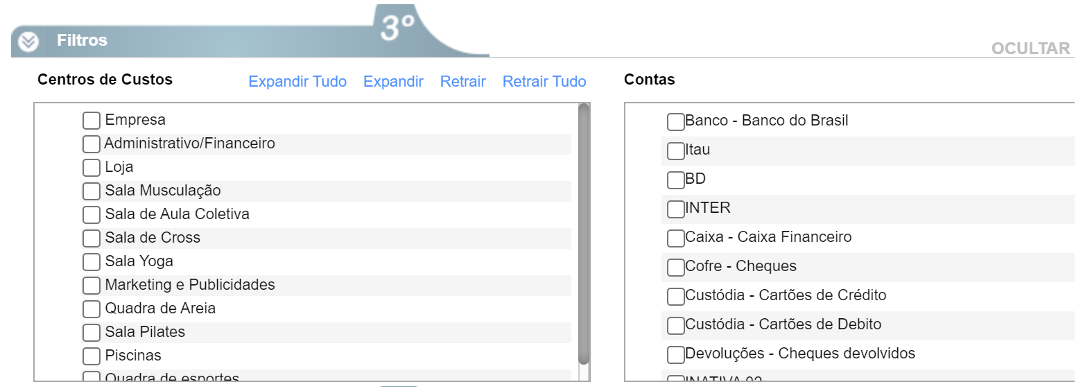 - Centros de Custos: caso deseje que os dados apresentados no relatório sejam referentes a um Centro de Custos específico, selecione marcando o checkbox a sua frente;